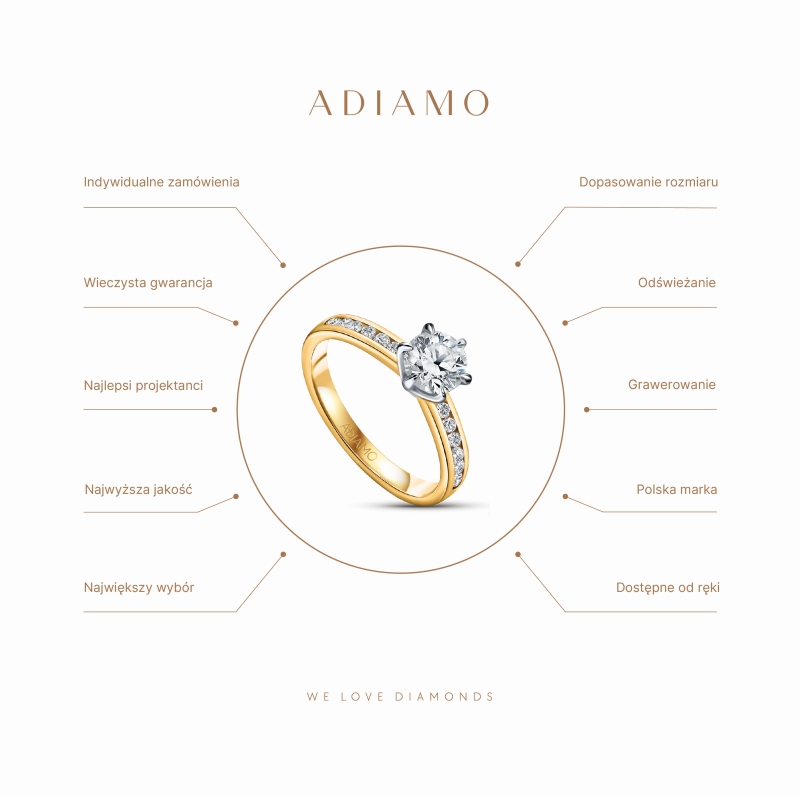 Diament naturalny to minerał o dużej twardości, przejrzystości i blasku. Wysoko ceniony przez jubilerów i miłośników klejnotów na całym świecie, jest ulubionym kamieniem zakochanych. Klasyczny pierścionek z brylantem to najpopularniejsza biżuteria zaręczynowa.